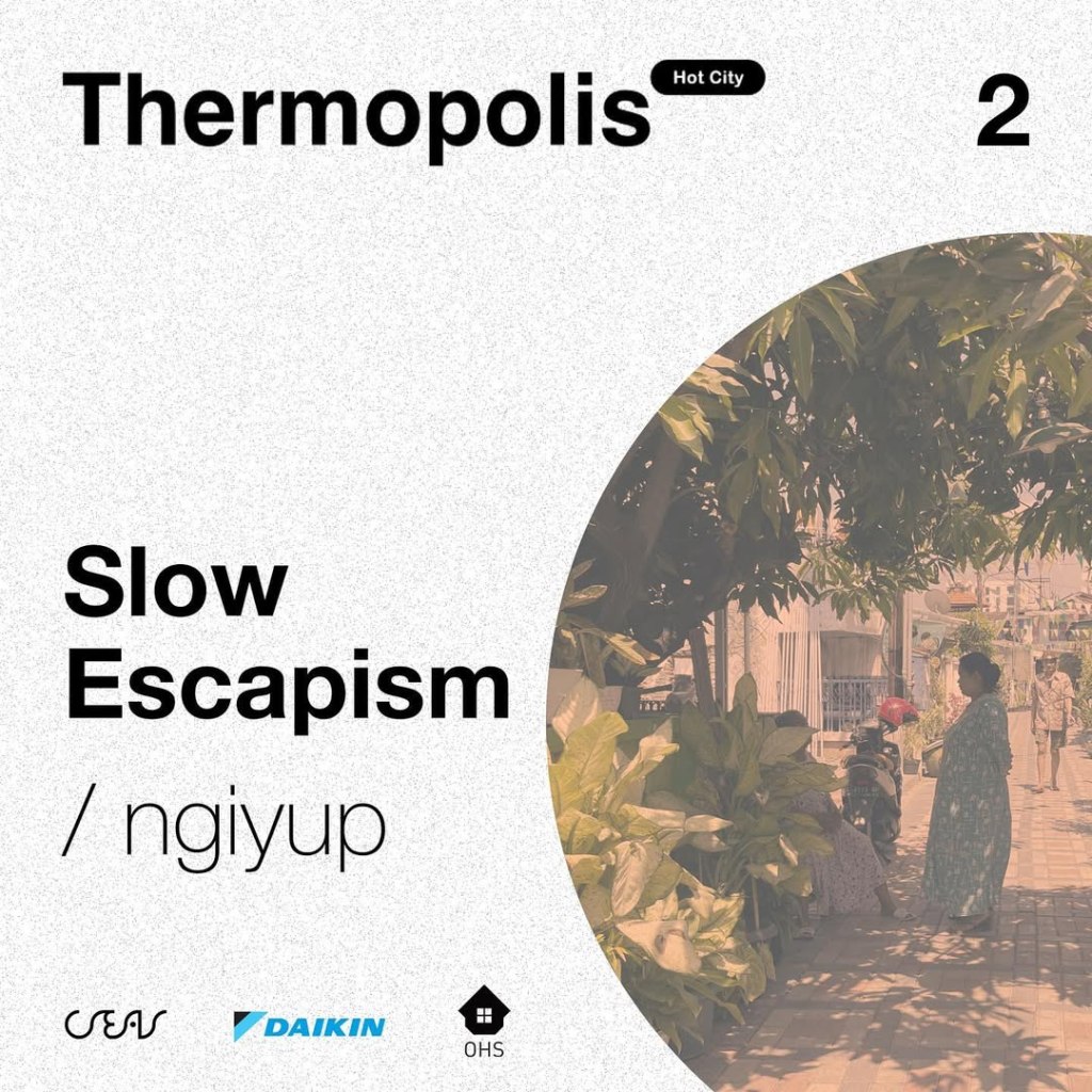 Slow Escapism / Ngiyup menjadi tema lokakarya Thermopolis kali ini sebagai analogi untuk pengetahuan-pengetahuan lokal yang akan digali oleh peserta selama lokakarya. Peserta akan dikondisikan dalam situasi lapangan yang menuntut kepekaan observatif juga inisiatif untuk bekerja secara kolaboratif bersama warga. Harapannya, lokakarya ini dapat menjadi stimulus bagi individu kreatif maupun warga kota untuk merefleksikan ulang serta mengapresiasi praktik hidup perkampungan kota dalam diskursus pemanasan global.